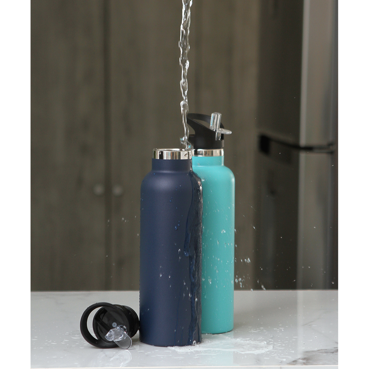 Botella Tamerici. - Botella deportiva de acero inoxidable doble pared con tapa plastica, popote y asa. Nuestra botella está fabricada en materiales de grado alimenticio y el acero inoxidable permite mantener tus bebidas frías o calientes por un largo tiempo. El popote puede contraerse lo que ayuda a mantener seguro el liquido de la botella.No usar en microondas. Capacidad de 750 ml. (25 oz) Incluye caja de cartón individual.