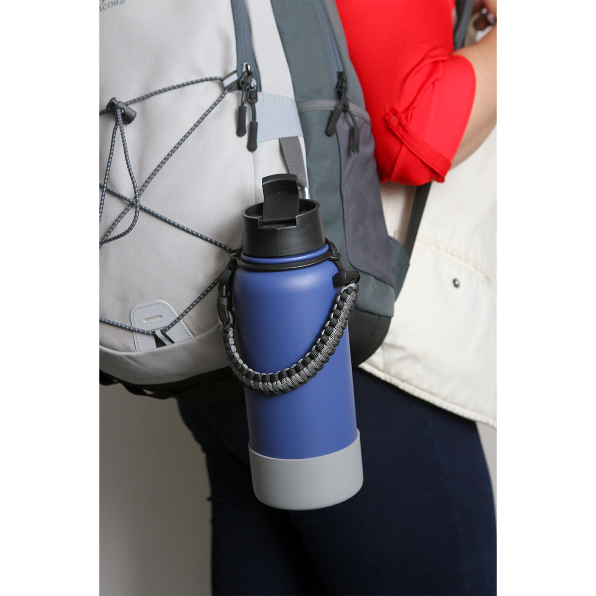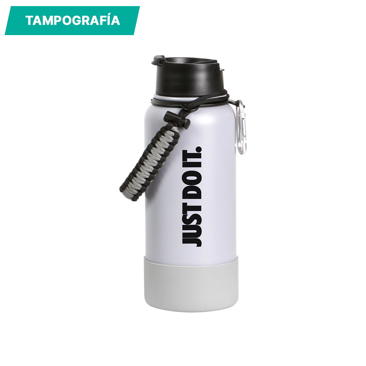 Botella Sarnen. - Botella deportiva, fabricada en acero inoxidable doble pared. Tapa de rosca con boquilla. Cuenta con capacidad de 1,000 ml. Incluye arnés, correa con detalles en gris y base de silicón anti derrapante.