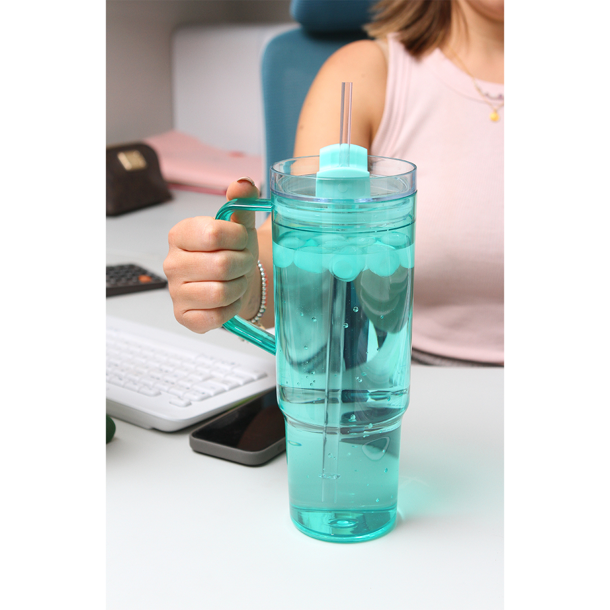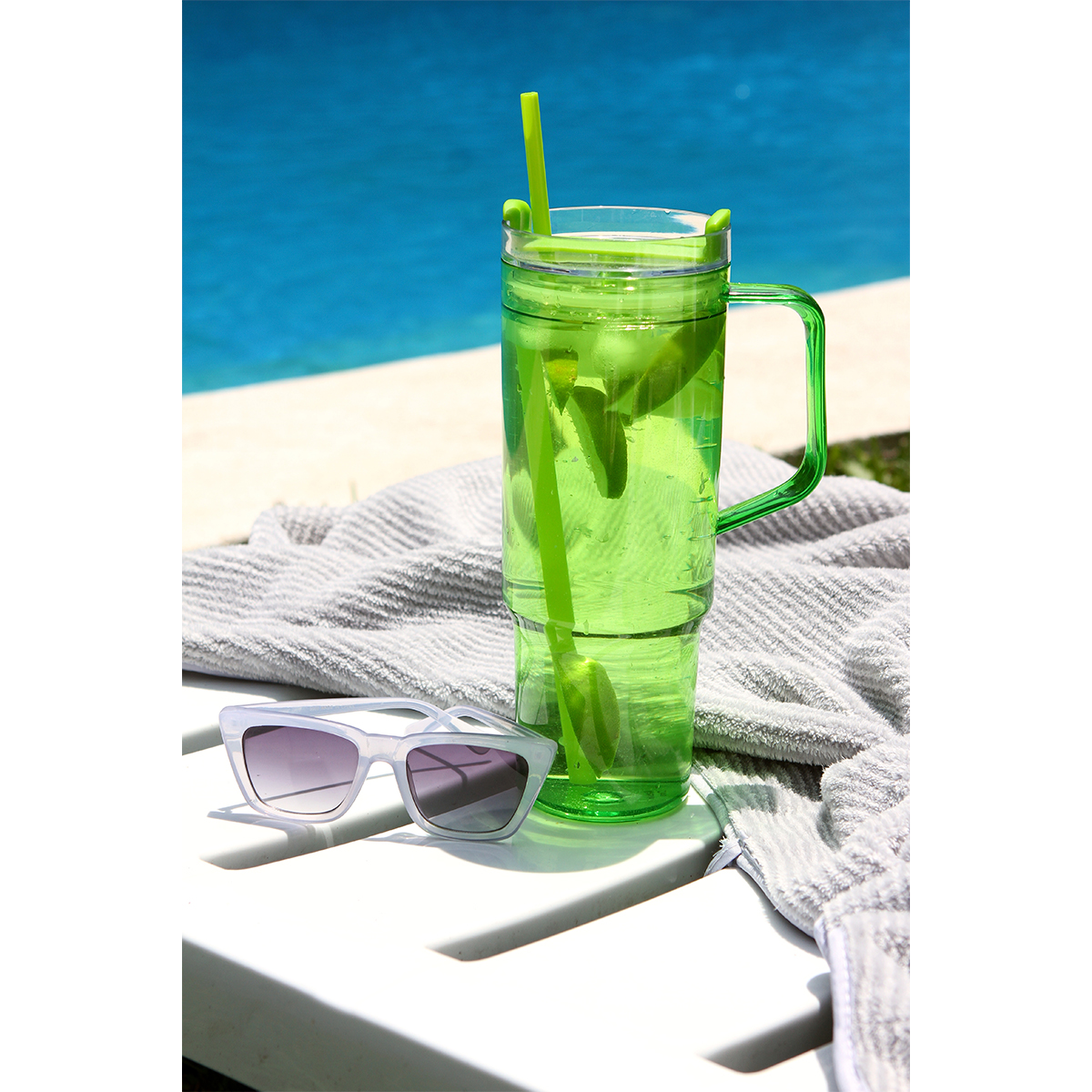 Vaso Eslov. - Vaso fabricado en plástico de una pared. Capacidad 1,200 ml. Incluye popote y agarradera. Detalles de color iguales al cuerpo.