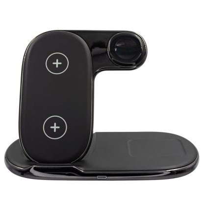 ESTACION DE CARGA INALÁMBRICA EXECUTIVE. Estación de carga inalámbrica portátil 3 en 1 (smartphone, smartwatch y auriculares) en color negro con acabados cromo-negro, doble zona de carga para smartphone.