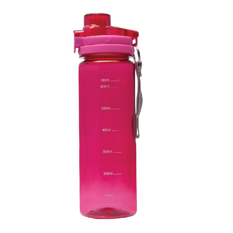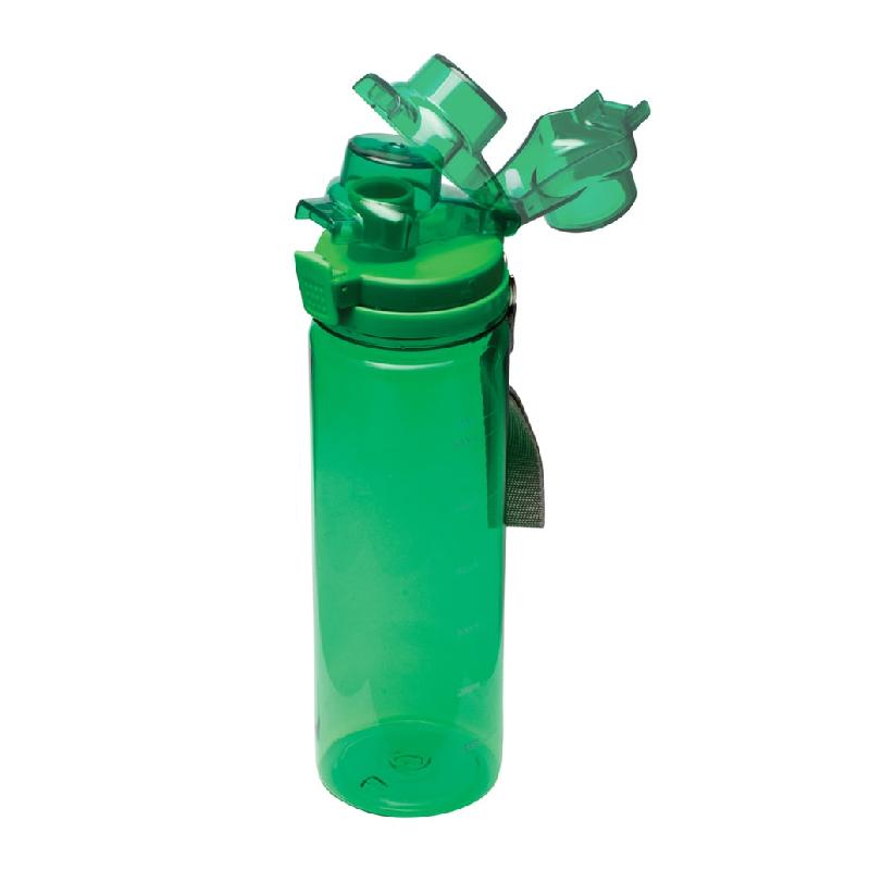Cilindro con doble seguro en la tapa para evitar derrames. Medidas: Ø 6.7 x 25 cm Material: Tritán Empaque: Bolsa de plástico.