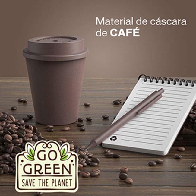 MATERIAL: 40% cáscara de café. 60% plástico PP MEDIDAS: Vaso: 11.5 x 5.5 cm diámetro. Block: 19 x 14 cm Bolígrafo: 14 x 1 cm MED. EMPAQUE: 55 x 52 x 34 PESO EMPAQUE: 9.7 kgs PIEZAS EMPAQUE: 40 pcs