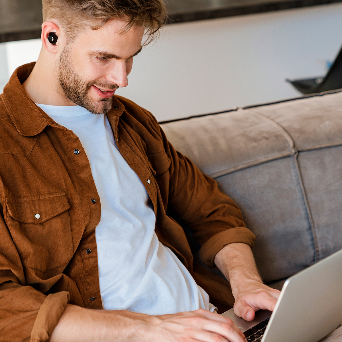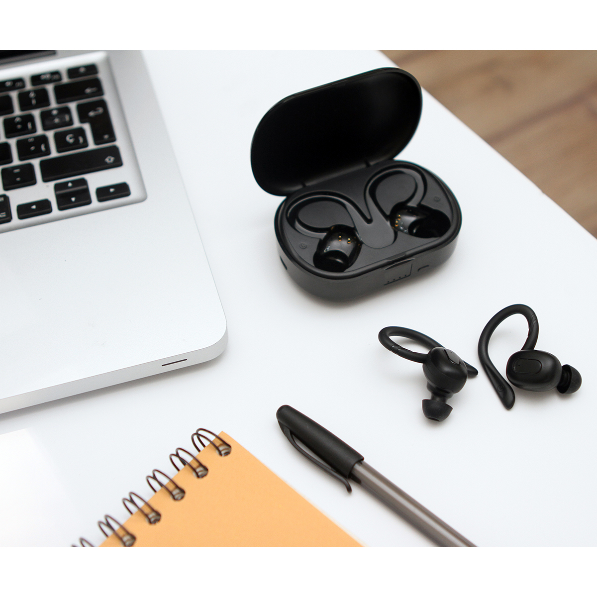 Audífonos Tokmak. - Audífonos con conexión de sonido sin cables, fabricados en plástico ABS con gancho anti caída de silicón y estuche de plástico. Incluye cable para carga USB y caja de cartón individual.
