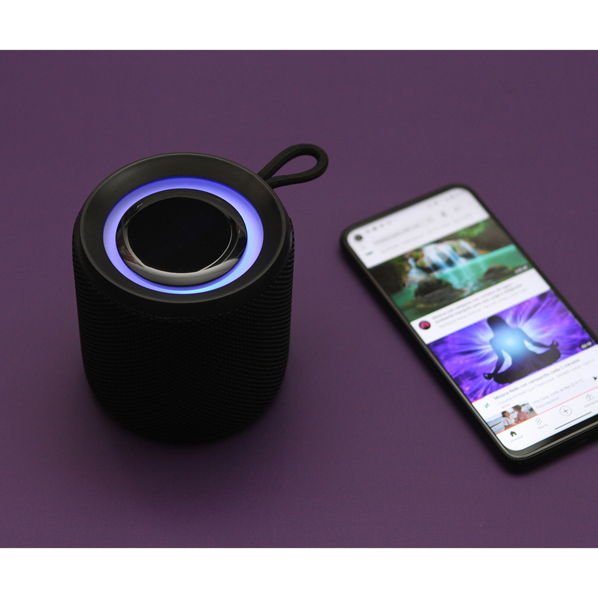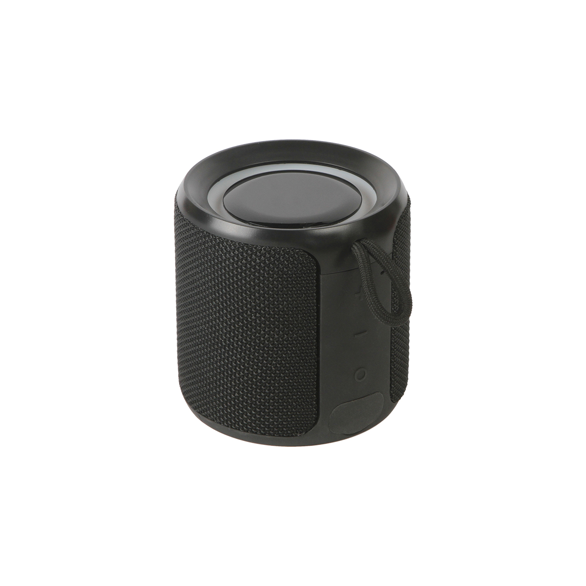 Bocina Bormio. - Bocina con conexión de sonido sin cables a prueba de agua fabricada en plástico ABS y metal, con cubierta de tela, acabado mate, cordón e iluminación led en la parte superior, a un costado tiene 3 botones para controlar el volumen, con una entrada protegida para recargar la pila. Incluye cable de carga USB y caja de cartón individual.