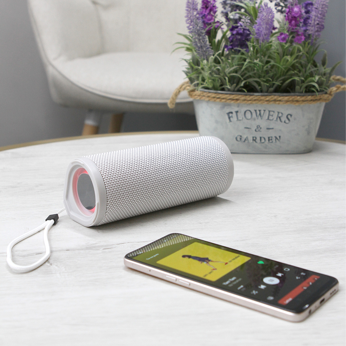 Bocina Piana. - Bocina con conexión de sonido sin cables, cilindrica con radio FM y entrada para tarjeta TF, fabricada en ABS, silicón y tela. Con iluminación en los laterales, fabricada en ABS, silicón y tela. Cable USB incluido. Incluye caja de cartón individual.
