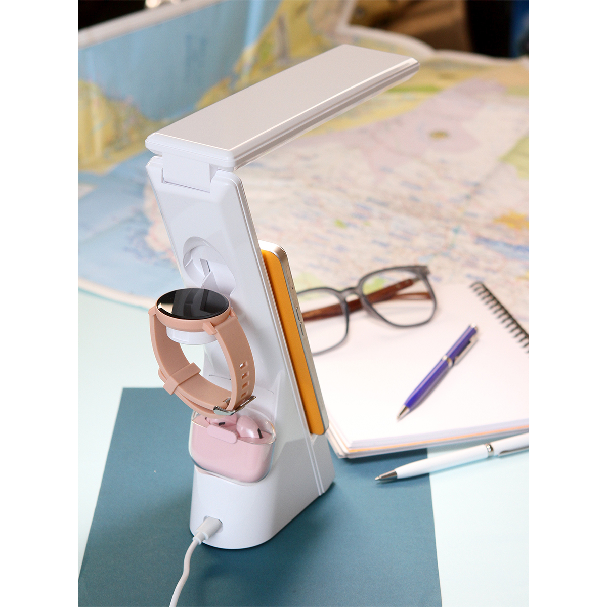 Lámpara Kotido. - Lámpara LED de escritorio con cargador Inalámbrico. Fabricado en plástico ABS cuenta con 3 modos de iluminación, aumento o disminución de brillo, reloj, despertador y estación de carga inalámbrica para teléfonos móviles o audifonos compatibles con tecnología Qi. Simplemente coloque el teléfono en la plataforma de carga inalámbrica de la lámpara de escritorio y el teléfono se cargará automáticamente.Esta lampara es ideal para alumbrar tu hogar u oficina y cargar tu dispositivo al mismo tiempo.Incluye caja individual