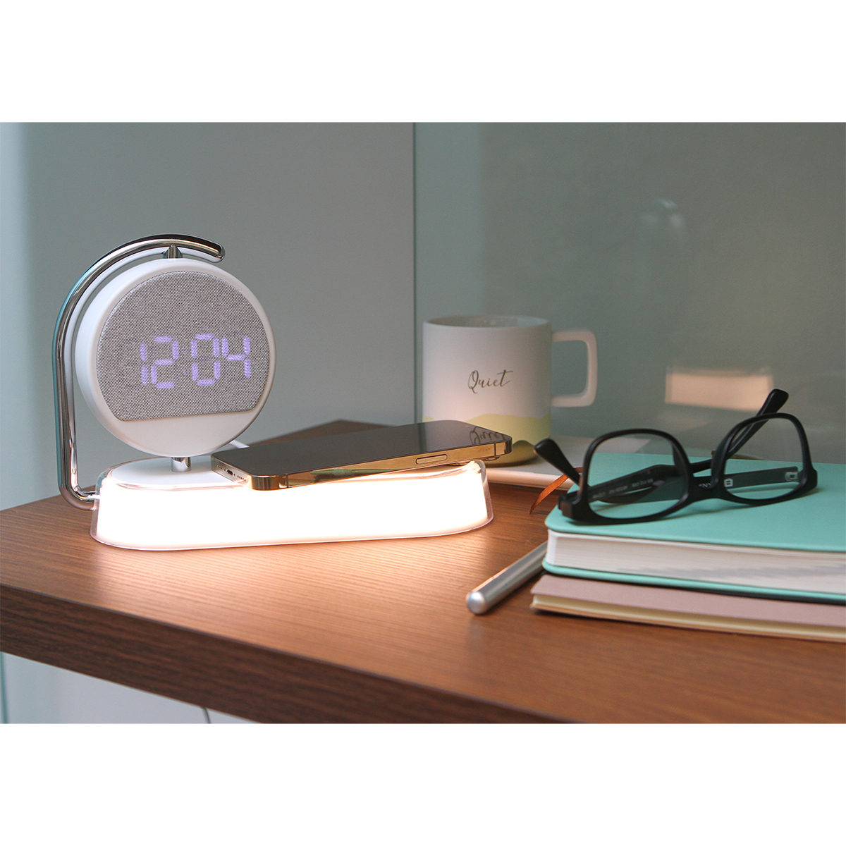 Cargador Faiti. - Cargador inalámbrico multifunción con potencia de hasta 15W. Incluye función de reloj y despetador. Además cuenta con lámpara LED. Producto innovador con diseño elegante. Compatible con dispositivos con tecnología Qi.