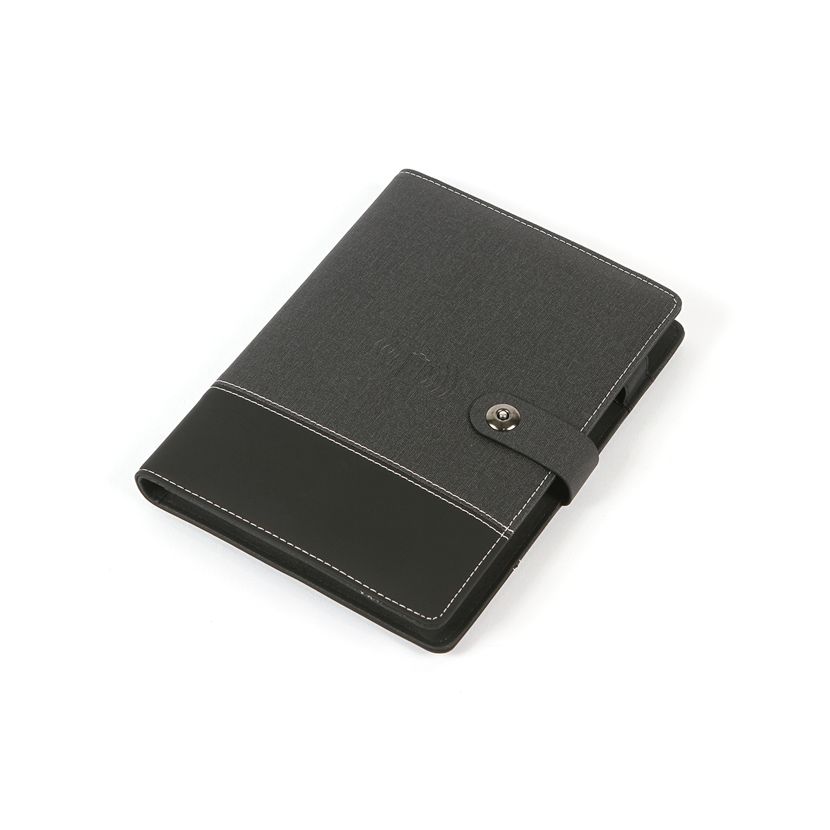 Libreta Chablis. - Libreta con cargador inalámbrico y power bank de 8,000 mAh, con compartimentos para almacenaje, porta bolígrafos, porta tarjetas y sujetadores de cables. La libreta cuenta con 90 hojas de 100g.