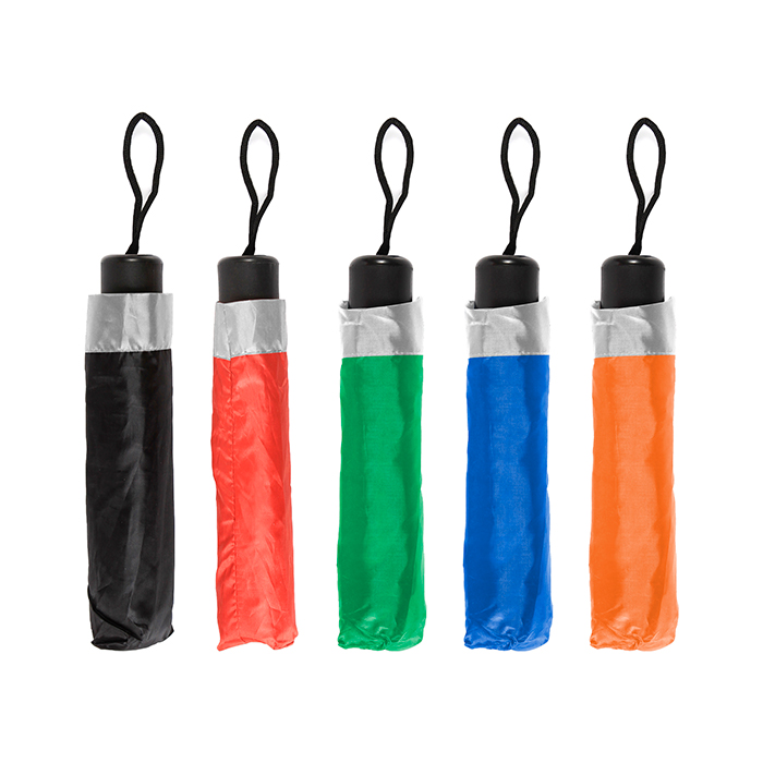 Paraguas Parma. - Paraguas de bolsillo en poliéster con 8 gajos, con lindo detalle color blanco al borde del mismo y en la parte inferior, con asa en la parte de mango (el cual es retráctil) para colgarlo y para mayor comodidad al momento de almacenarlo o transportarlo. Incluye funda, esta misma tiene un detalle color plata en la parte superior.
