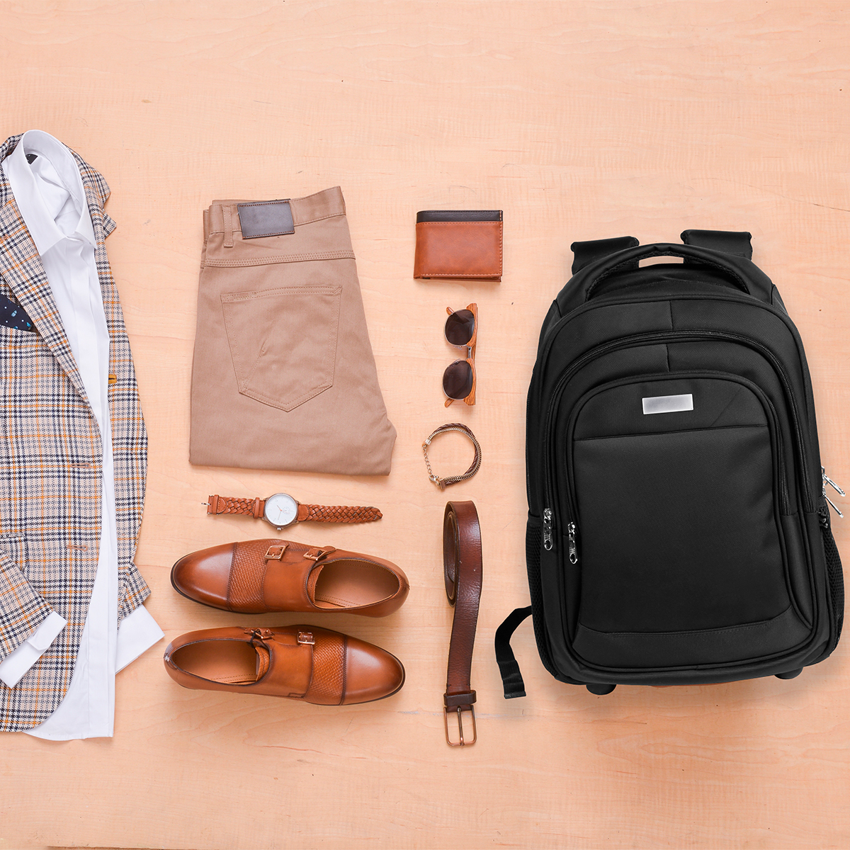 Mochila con ruedas. - Mochila con ruedas y tirantes para bag pack, compartimentos central y frontal con porta laptop y mango abatible de aluminio, fabricada en nylon de alta resistencia, incluye placa metálica para grabado de logo.
