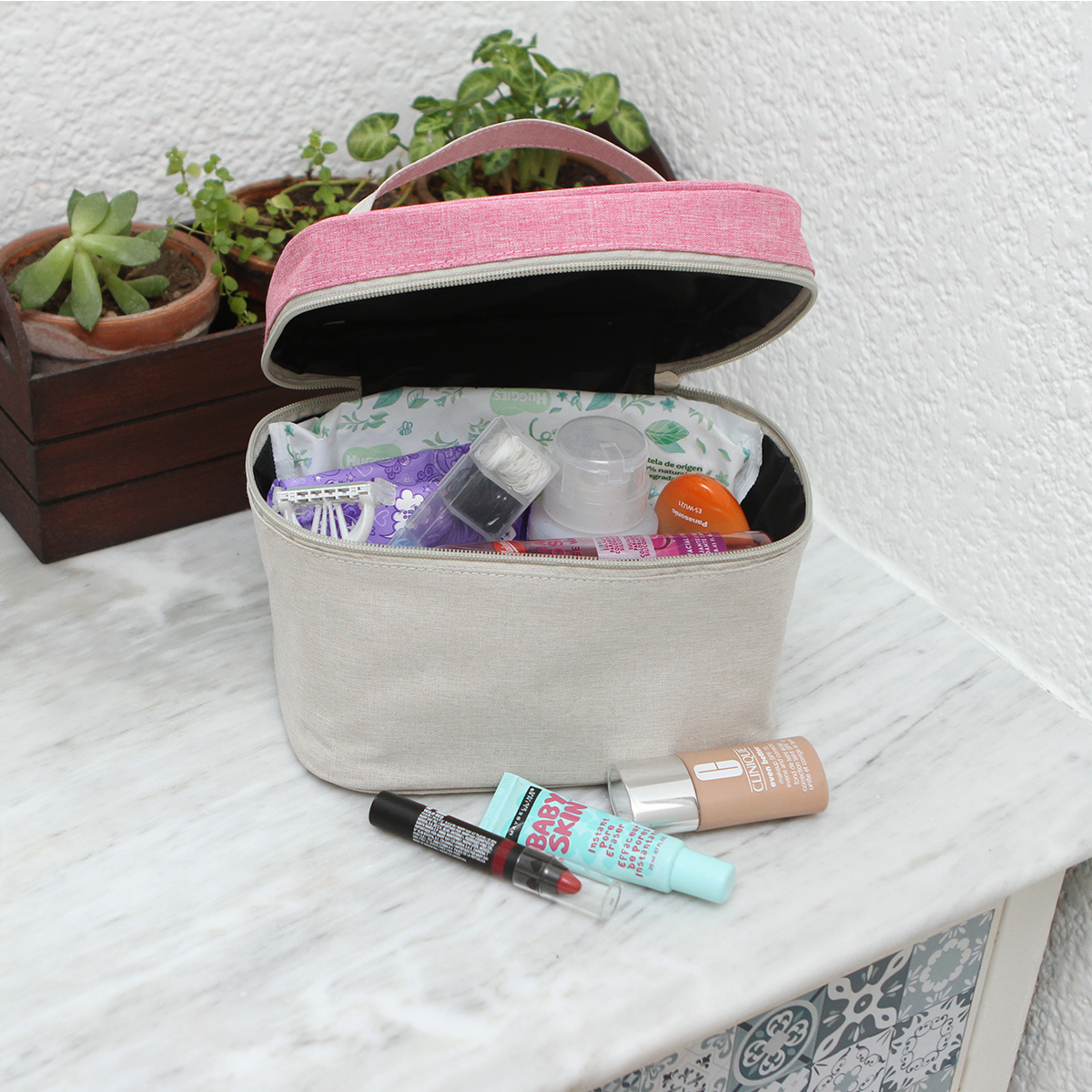 Cosmetiquera Bomet. - Cosmetiquera bi-tono fabricada en poliéster, bolsa de maquillaje portátil, con detalle de color en la parte superior, cuenta con una asa en la parte superior.