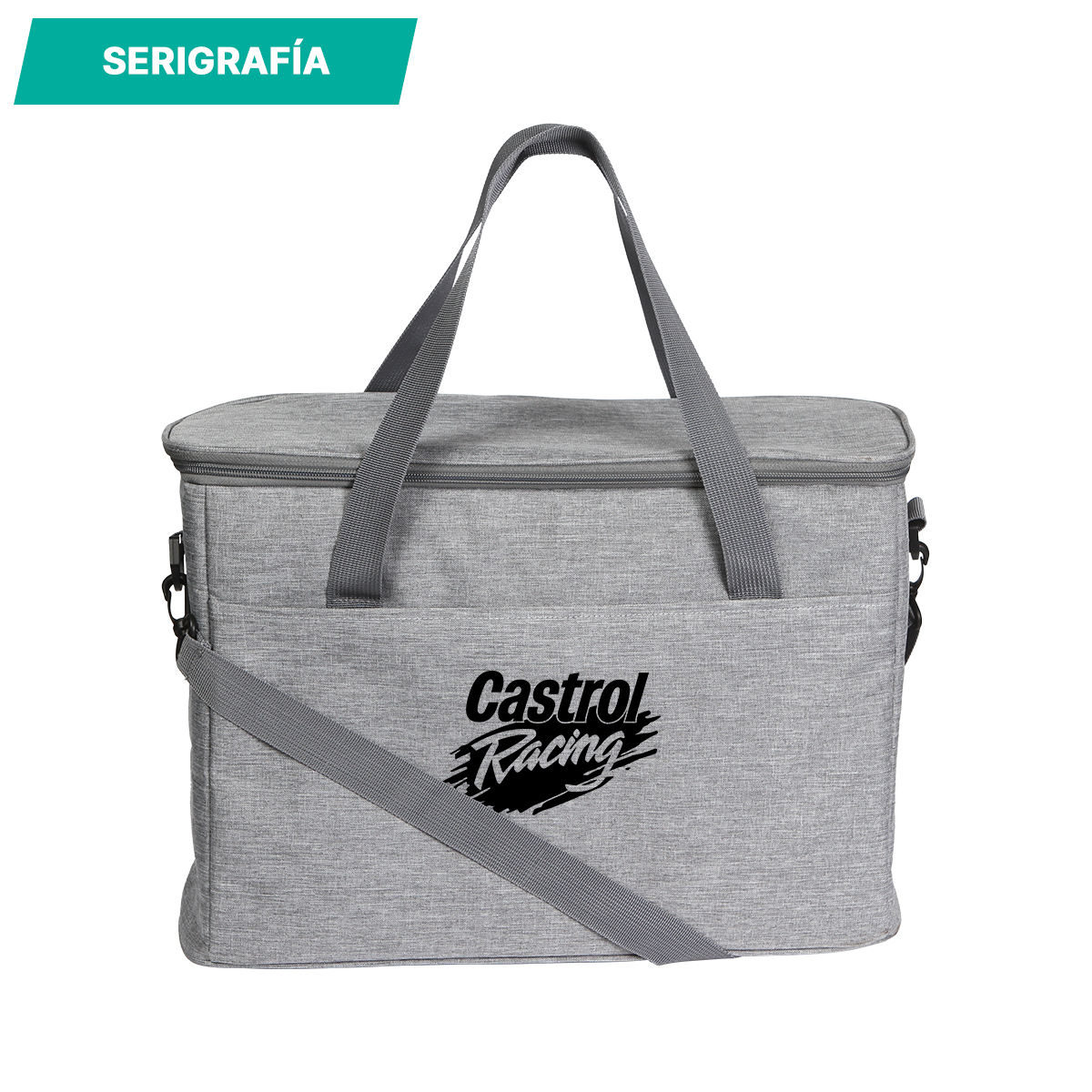Hielera Alcamo. - Hielera térmica fabricada en poliéster con forro de aluminio para mantener la temperatura de los alimentos, bolsillo frontal, bolsillo interno de malla, correa para hombro ajustable (la cual es desmontable) y asa superior.