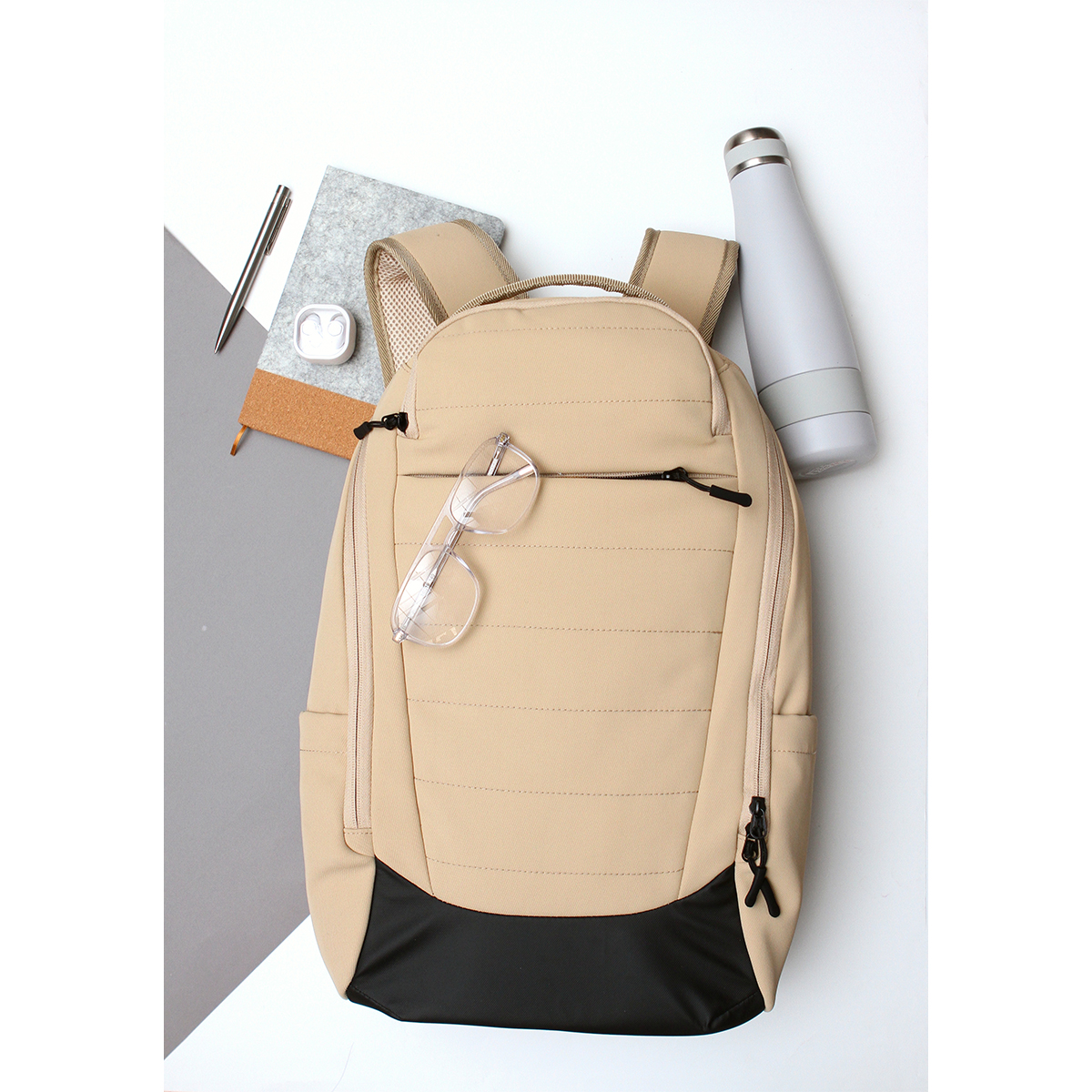 Mochila Namibe. - Mochila confeccionada en tejido sarga compuesto con respaldo de punto y tejido taslon rip stop, forro 210D 100% poliéster. Parte inferior: 600D con revestimiento de TPE, un bolsillo principal con cremallera, compartimento para computadora portátil, dos bolsillos frontales con cremallera y dos bolsillos laterales extensibles. Correa para espalda y hombro acolchada con espuma y malla para reducir el estrés. Correas: correas de PP 600D. Volumen: 21,5 litros.