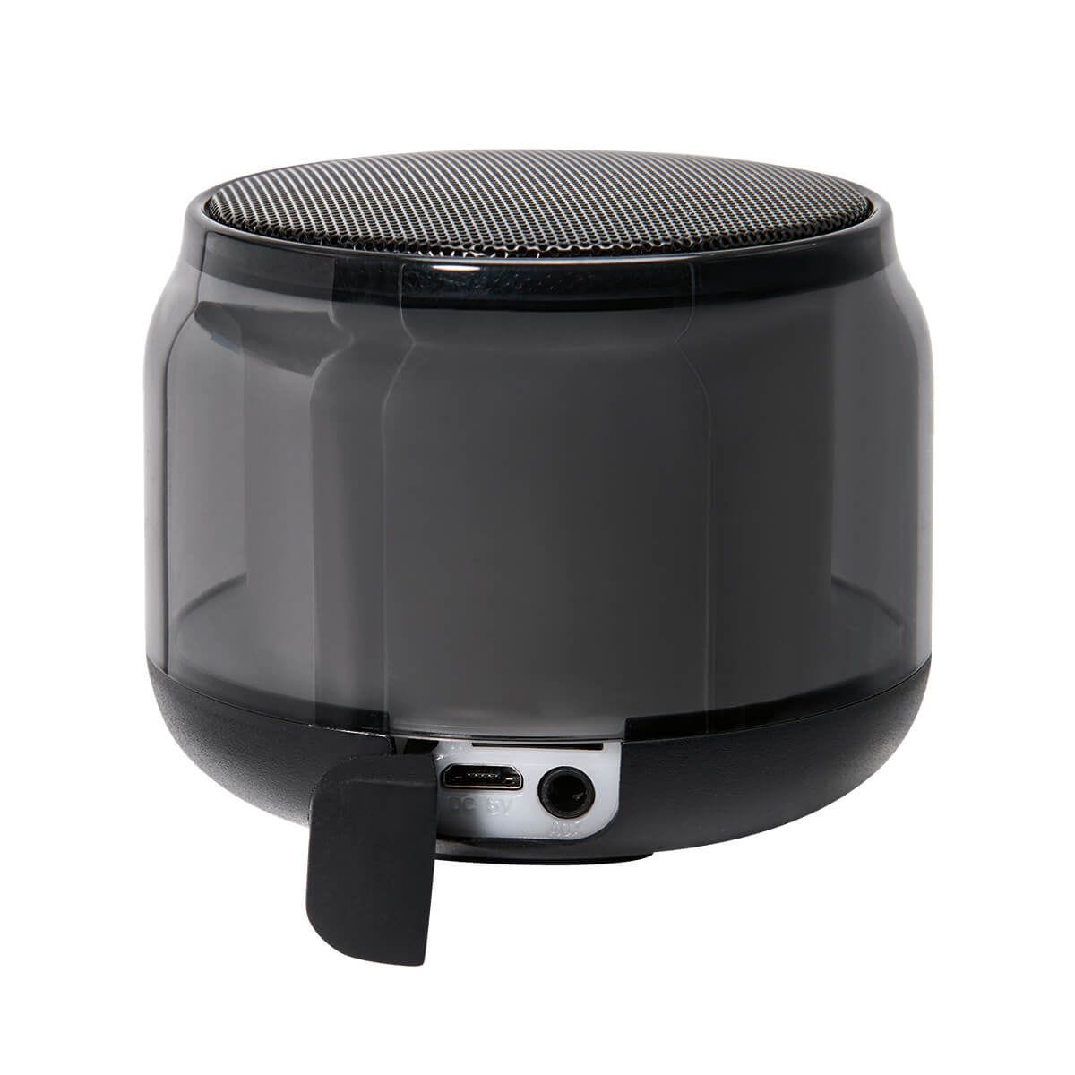 BOCINA FREY - Bocina bluetooth recargable con luz RGB ajustable a 3 efectos diferentes. Reproducción de música 3 hrs aproximadamente. Controles integrados para llamadas, volumen y reproducción de audio. Rango de conexión 10 metros. Cuenta con puerto Tipo C, TF y entrada auxiliar de 3.5 mm. Incluye cable cargador USB.