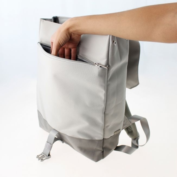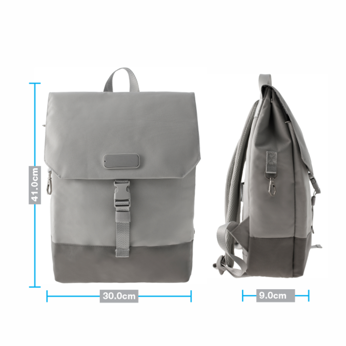 Mochila ultra ligera fabricada en tela repelente al agua con un acabado en teflón que evita adherencias de polvo y facilita su limpieza. Los compartimentos están protegidos por una solapa que se abrocha en la parte frontal. Compartimento principal con espacio para laptop de 15.6" (full padding), y 2 pequeñas bolsas situadas en la parte alta para celular o artículos pequeños que requieran fácil acceso. Cuenta con un par de pequeños broches metálicosen los laterales superiores y un gancho tipo mosquetón en uno de los costados. Asas de colgar acolchadas y correa para sujetarse en bastón de maleta. El diseño posterior además de aportar una sensación confortablecrea canales que permiten que el aire circule. Peso: 0.62 Kg. Capacidad: 11.07 litros.