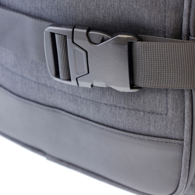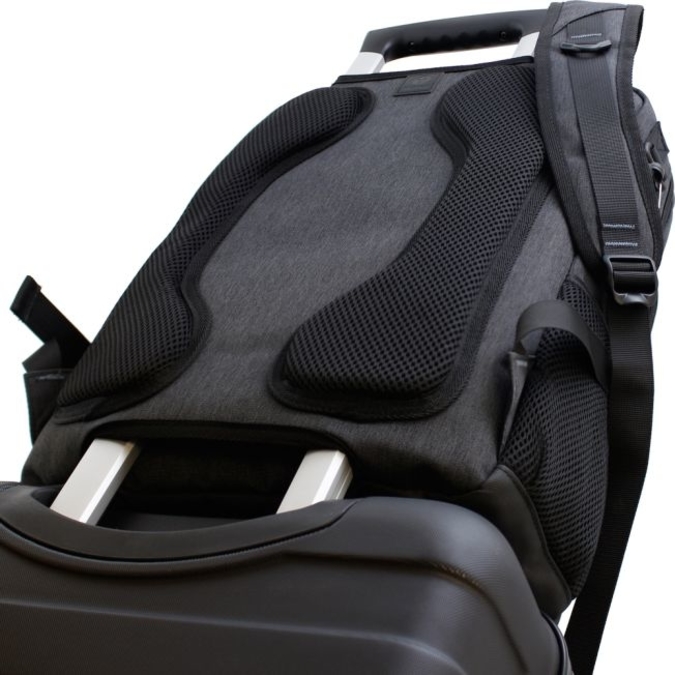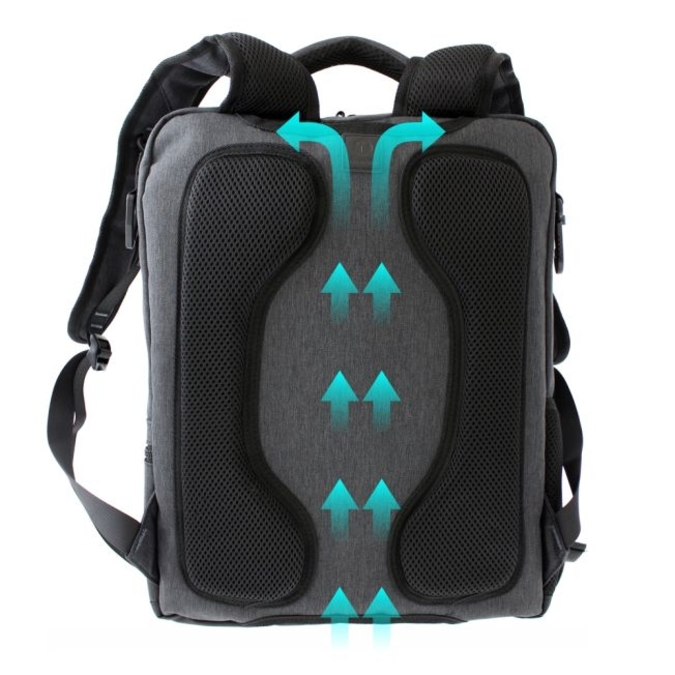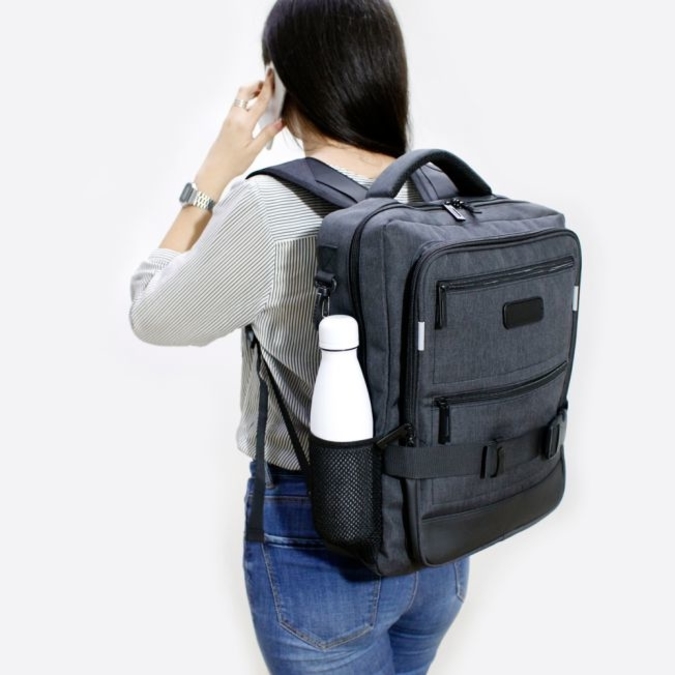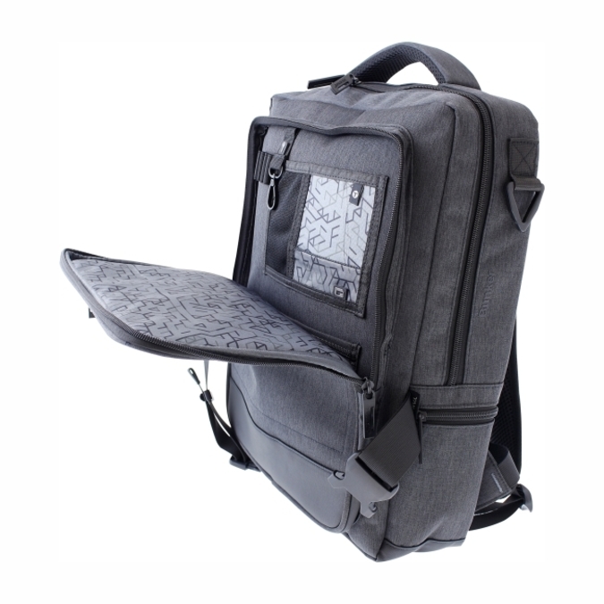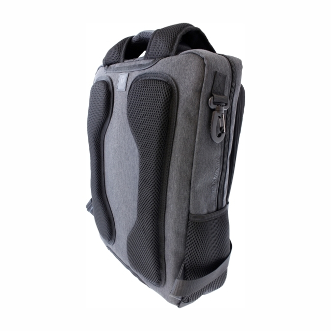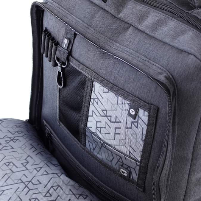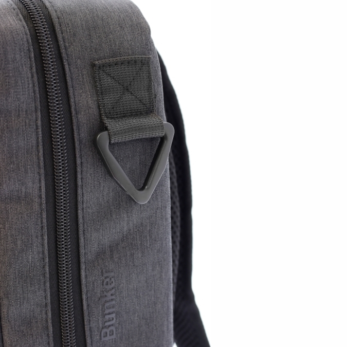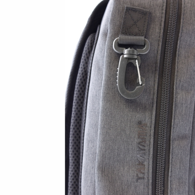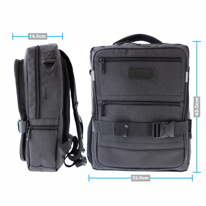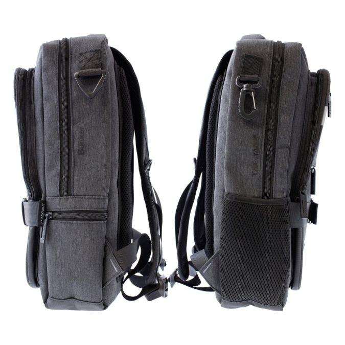 Mochila Takayama Bunker Mochila marca TAKAYAMA, fabricada en resistente tela gris obscuro. Detalles en curpiel texturizado. Materiales que repelen el agua. Cuenta con doble padding: Hacia el exterior con mayor resistencia al impacto, y hacia el interior con mayor suavidad para proteger el equipo. Bolsa frontal con multi compartimentos para organizar artículos pequeños. Compartimento principal con espacio para lap top y bolsa con sistema de protección RFID. Cuenta con reflectantes laterales de alta visibilidad. Apertura en la espalda que permite pasar el bastón de la maleta de manera estable. Peso: 1.26 Kg. Capacidad: 18 Litros.