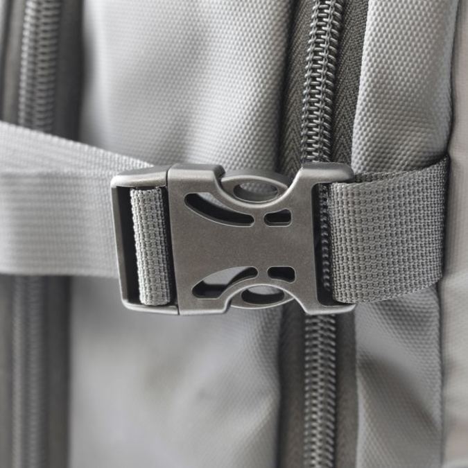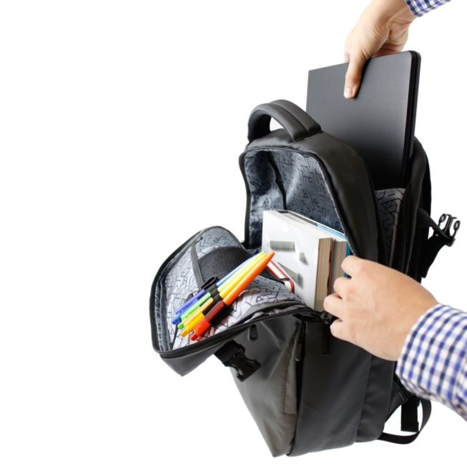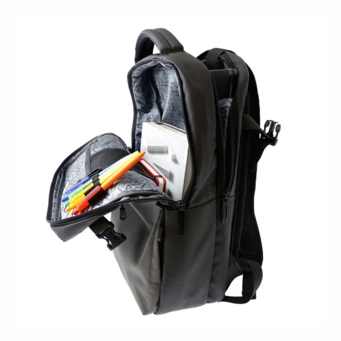 Mochila Takayama Tekna Mochila marca TAKAYAMA, ideal para viajes de negocio, recreativos o para el uso cotidiano. Curpiel de suave textura en combinación gris y negro. Material repelente al agua fácil de limpiar. Cuenta con 2 compartimentos principales de gran dimensión. Ambos con doble tira cierres con orificio para candado. Organizador de accesorios y espacio para lap top de 15.6” con padding de alta resistencia. Tres bolsas frontales de diferentes dimensiones ideal para facilitar el acceso a tus pertenencias. Asas de colgar acolchadas con bandas reflectantes de alta luminosidad. Bolsa lateral para bebidas con elástico de seguridad. Manga posterior para colocar en bastón de maleta. Canal de ventilación en espalda. Peso: 1.05 Kg. Capacidad: 20 Litros.