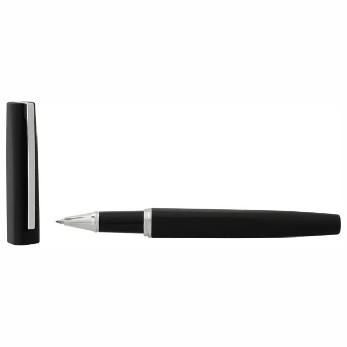 Square Bolígrafo metálico de cuerpo cuadrangular con tapón que cierra a presión. Detalles color cromo. Suave textura ahulada. Escritura de alto desempeño debido a su repuesto japonés tipo roller (a elegir entre tinta negra o azul). Incluye estuche individual.
